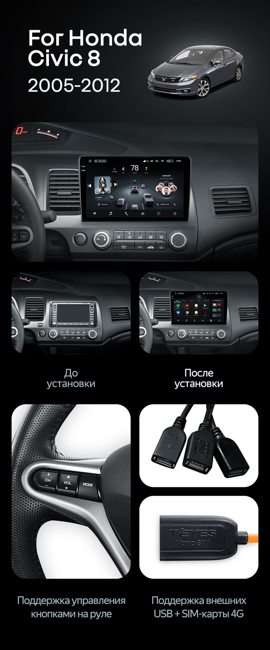 Штатная магнитола Teyes CC4 Pro 12/256 Honda Civic 8 FK FN FD (2005-2012) - купить всего за 67 750 руб. в интернет-магазине в Барнауле Teyes.com.ru. ✓ Самый лучший выбор мультимедиа ✓ Лучшая замена штатному ГУ ✓ Тел. +7 (800) 775-31-74