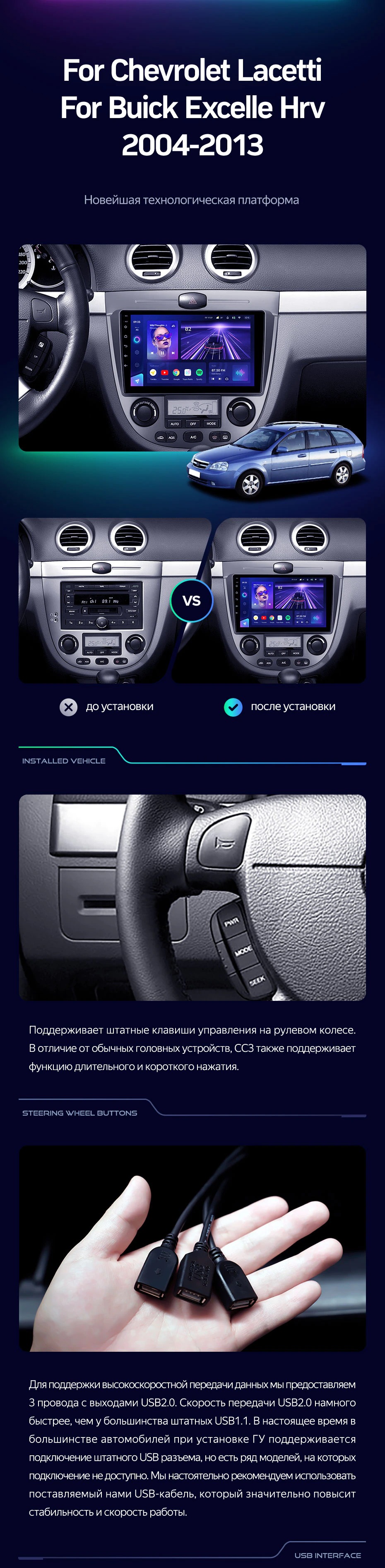 | USB | 3×USB 2.0 + USB 3.0 | Доп. аксессуары | Передняя/задняя AHD-камера, DVR-регистратор, TPMS, парковочный OBD, Type-C → HDMI |