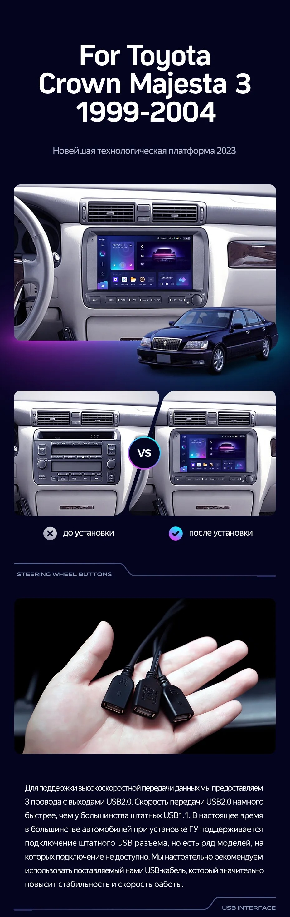 Полный комплект установки магнитолы Teyes с рамкой и проводкой можно выбрать в каталоге штатных магнитол Toyota Crown Majesta 3 S170 (1999-2004).