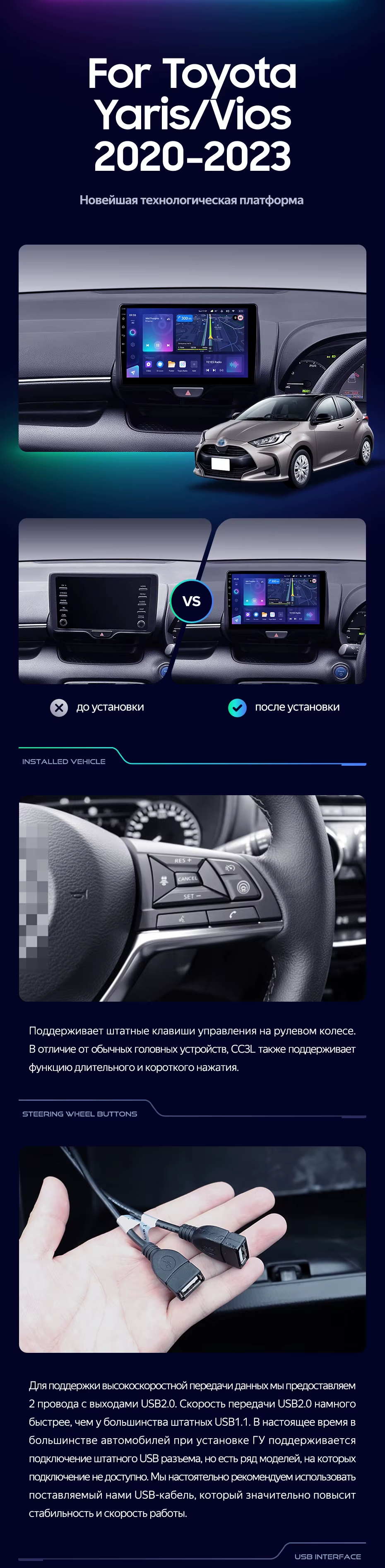 Готовый установочный комплект для магнитолы Toyota Yaris Vios (2020-2023) Правый руль 10 дюймов в штатное место, включает переходную рамку и проводку.