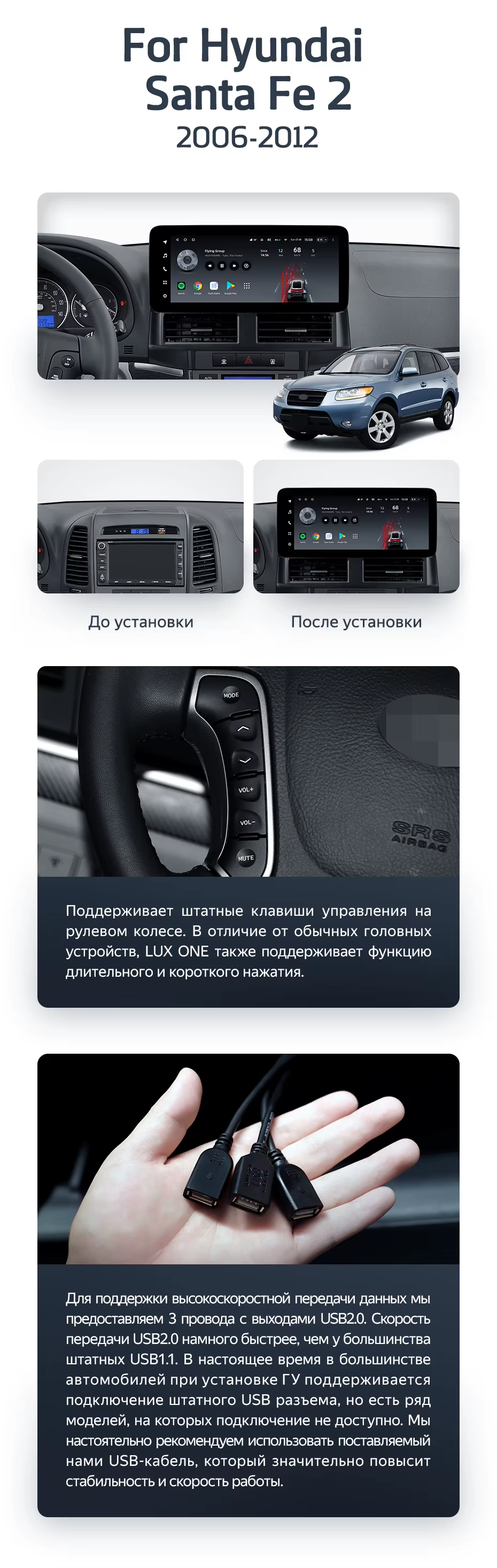 Установочный комплект для Hyundai Santa Fe 2 (2006-2012) включает переходную рамку и проводку.
