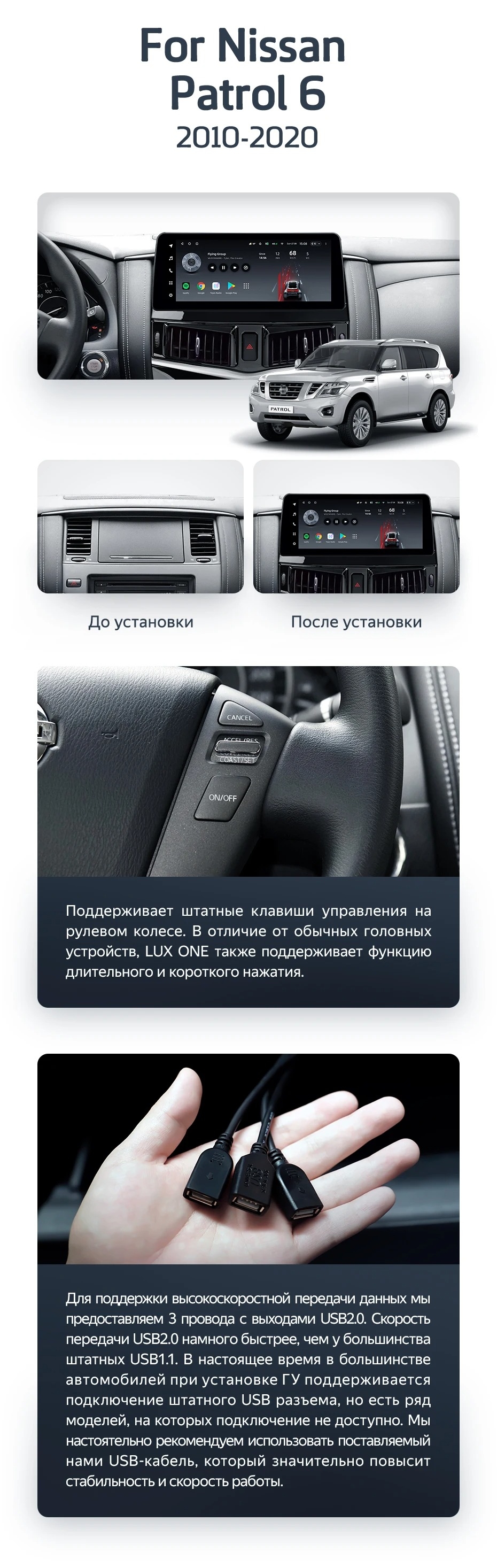 Полный комплект установки магнитолы Teyes с рамкой и проводкой можно выбрать в каталоге штатных магнитол Nissan Patrol 6 Y62 (2010-2020).