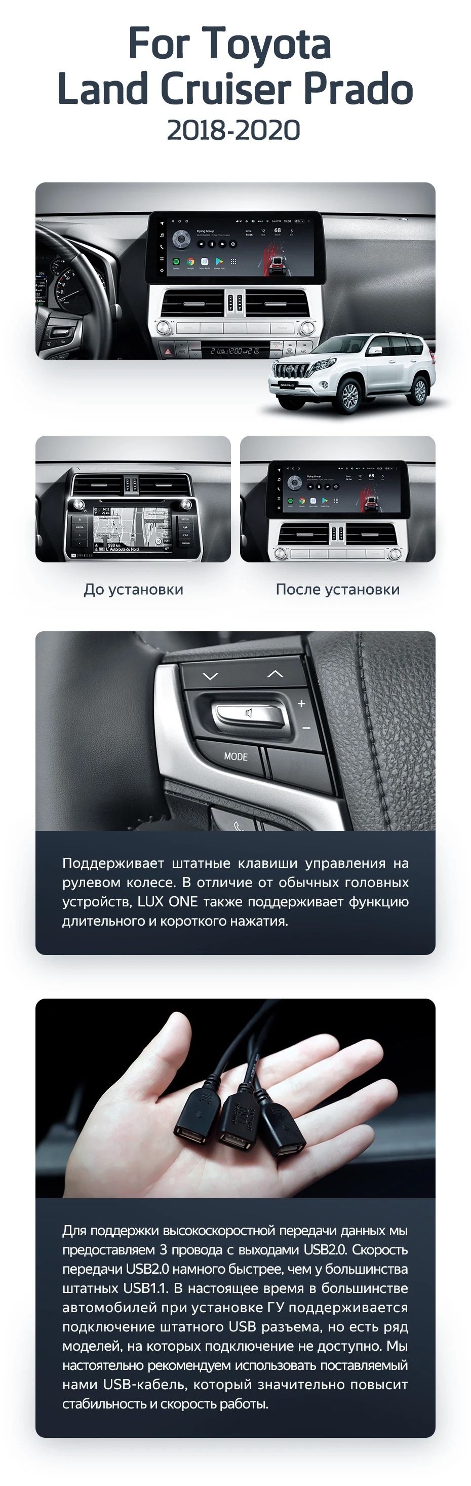 Полный комплект установки магнитолы Teyes с рамкой и проводкой можно выбрать в каталоге штатных магнитол Toyota Land Cruiser Prado 150 (2018-2020).